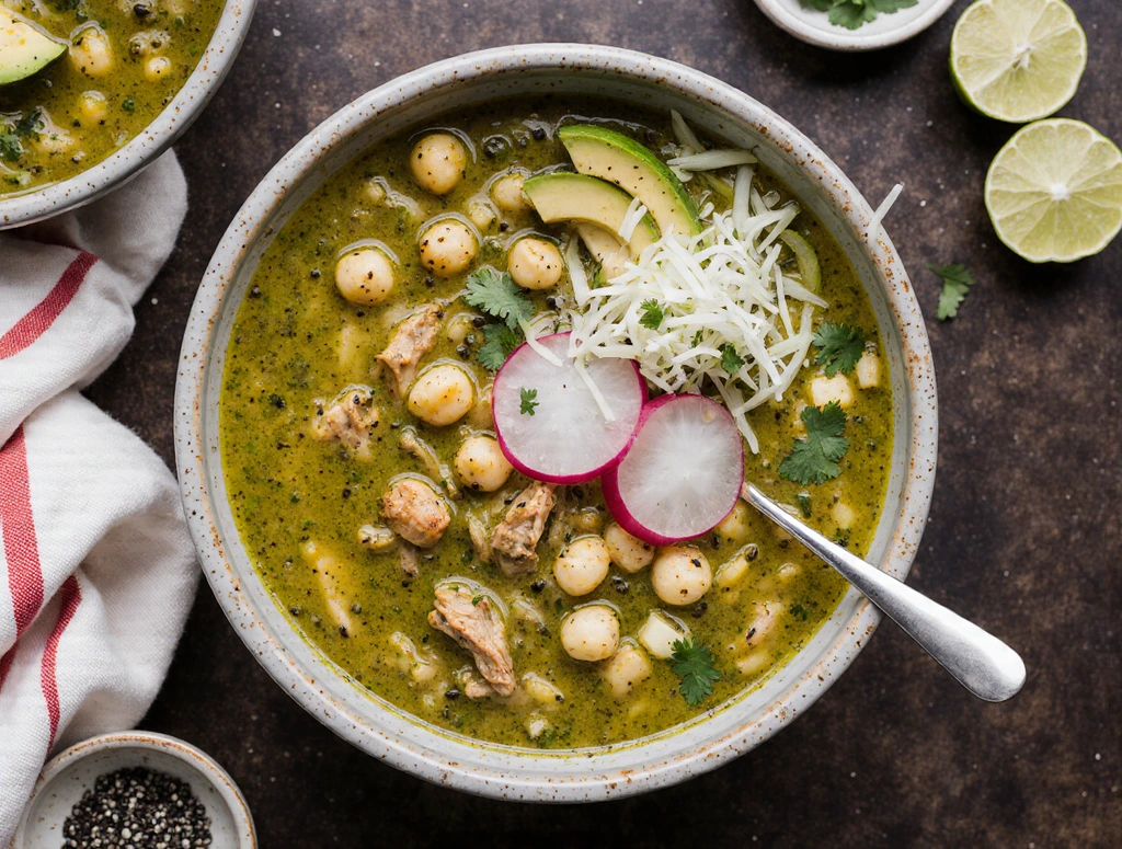 Chicken Pozole Verde is a traditional Mexican green soup made with tender shredded chicken, hominy, and a vibrant tomatillo-cilantro broth. This hearty yet fresh soup is packed with bold flavor and finished with customizable toppings like avocado, radishes, and lime.