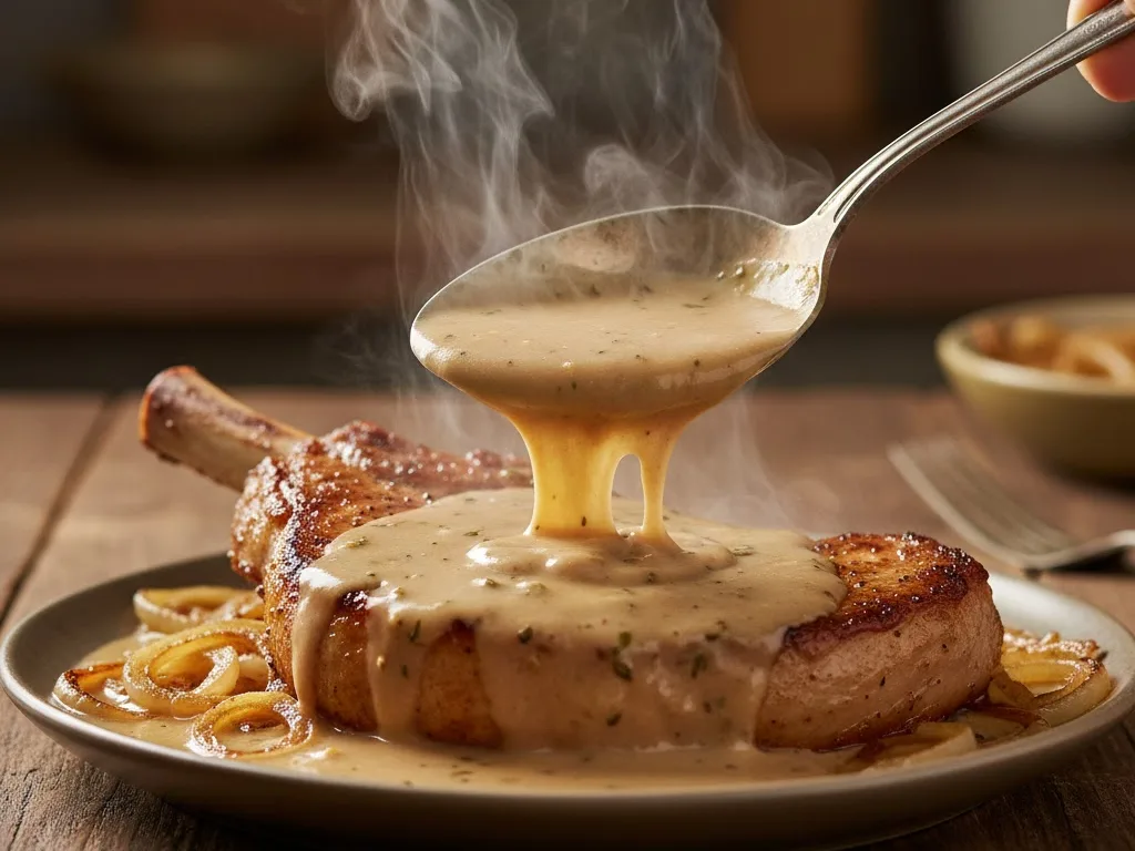 Spoon pork chops into shallow bowls. Add extra gravy on top. Serve with sides that soak up sauce.