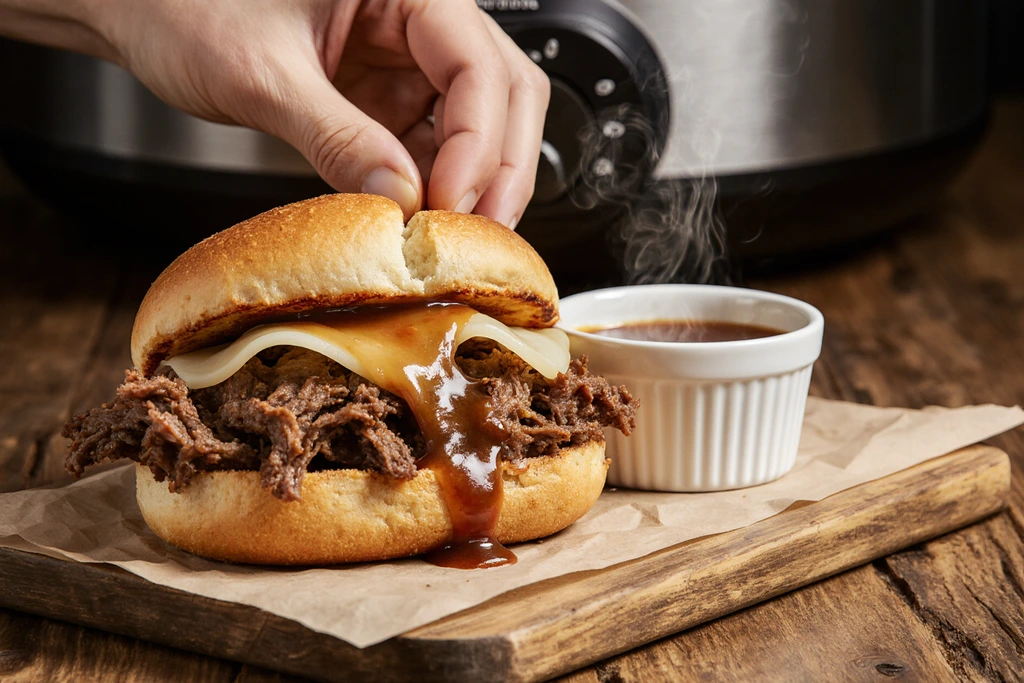 Crockpot French Dip Sandwiches deliver tender, fall-apart beef piled high on toasted hoagie rolls with melted provolone cheese and rich au jus for dipping. This easy recipe requires just 10 minutes of prep, making it perfect for busy weeknights while surpassing restaurant versions like Arby’s with homemade flavor.