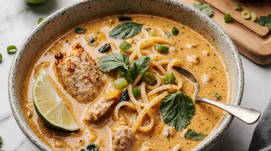 The finished soup is silky, aromatic, and well-rounded. The curry paste provides warmth rather than overwhelming heat, while coconut milk softens the spice. Lime juice adds brightness, and fresh herbs lift the entire dish. The chicken remains tender, and the noodles provide satisfying texture without heaviness.