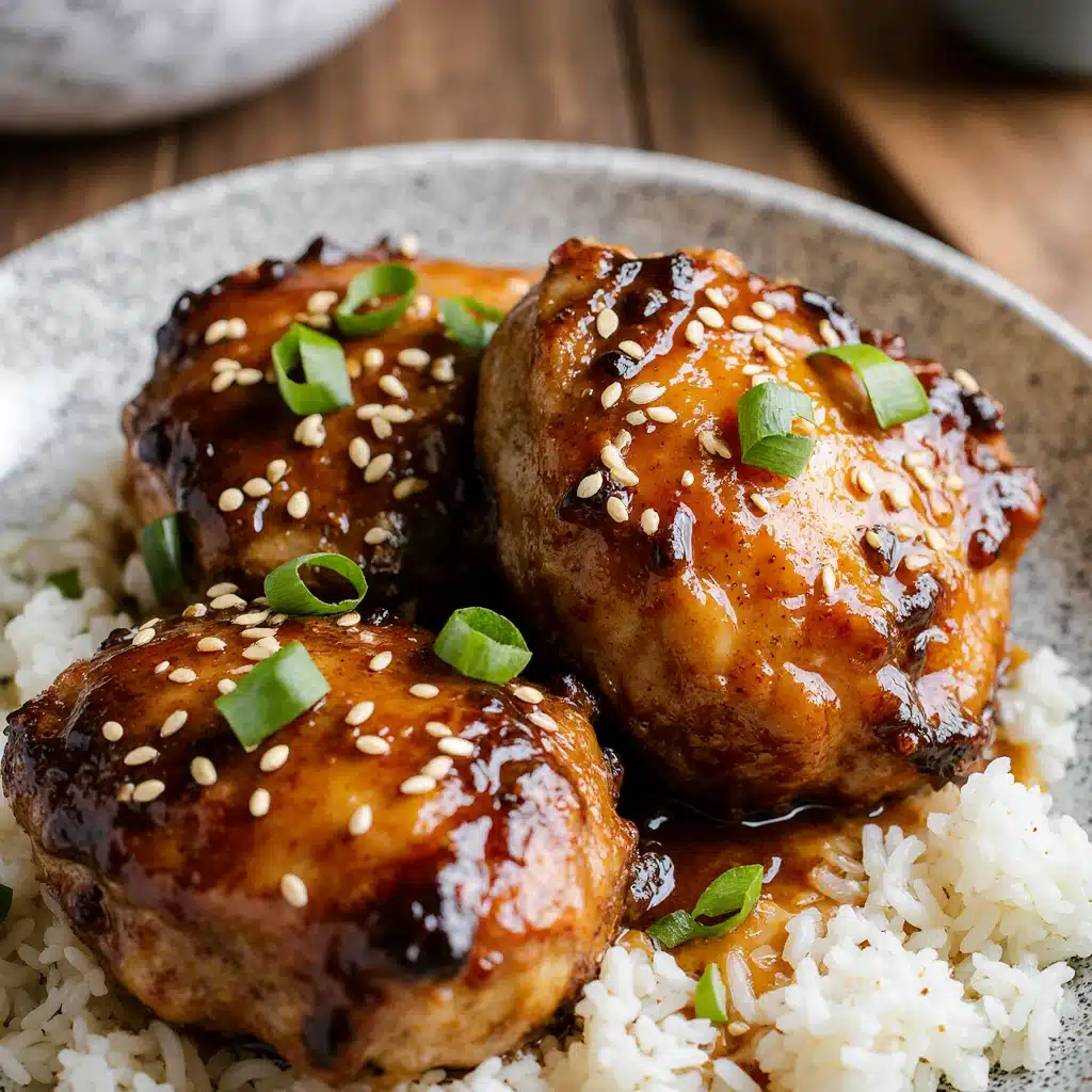 2 pounds chicken thighs, boneless skinless For serving: chopped scallions, sesame seeds, rice (optional) Sauce: 1/3 cup low-sodium soy sauce 1/3 cup honey 1/3 cup ketchup 6 cloves garlic, minced 1/2 teaspoon apple cider vinegar 1 teaspoon grated fresh ginger 1 pinch crushed red pepper flakes (optional) 2 tablespoons cornstarch