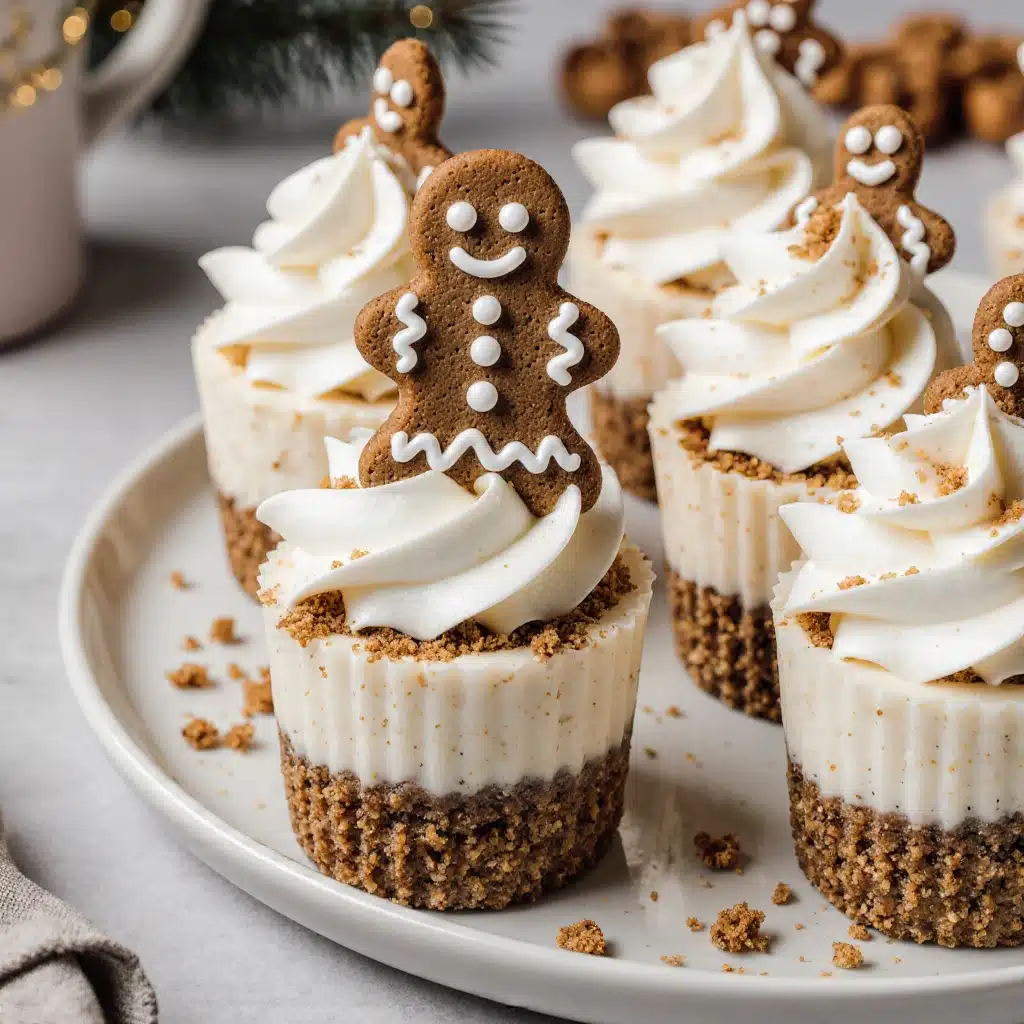 Creamy no-bake gingerbread cheesecake cups with a spiced cookie crust and festive holiday toppings.