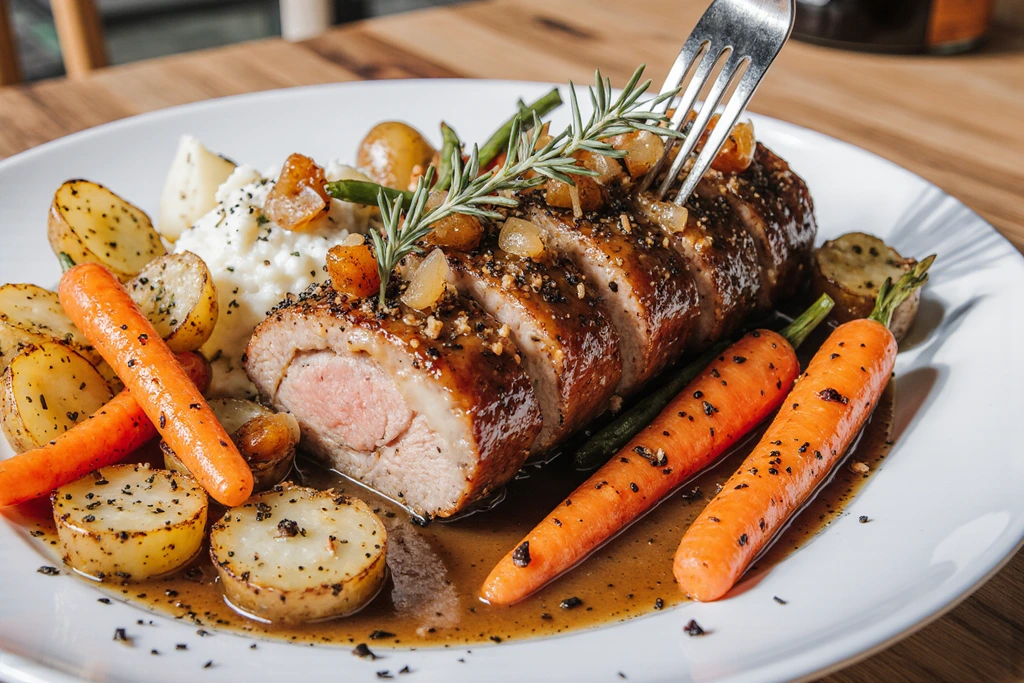 2. Rest and Thicken Sauce: Transfer pork to platter; rest 15 minutes under foil. Simmer juices on stovetop 5 minutes to syrupy consistency.​