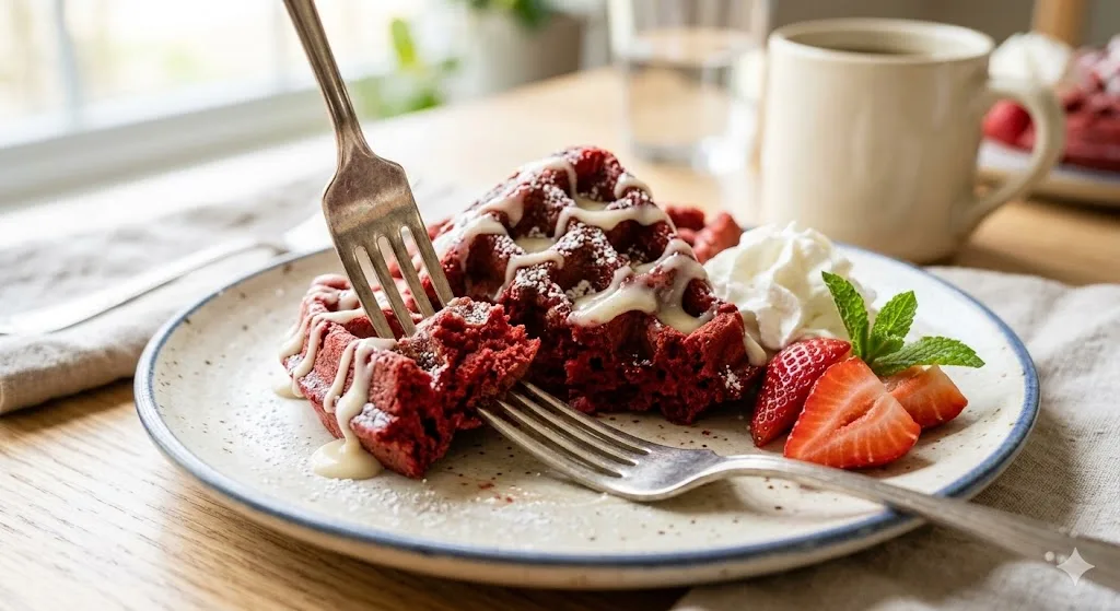 What I love about this recipe is that it’s still simple: you mix dry ingredients in one bowl, wet ingredients in another, then fold them together and cook in your waffle iron. For toppings, you can keep it easy with maple syrup and whipped cream, or go full red-velvet-dessert mode with a quick cream cheese drizzle.