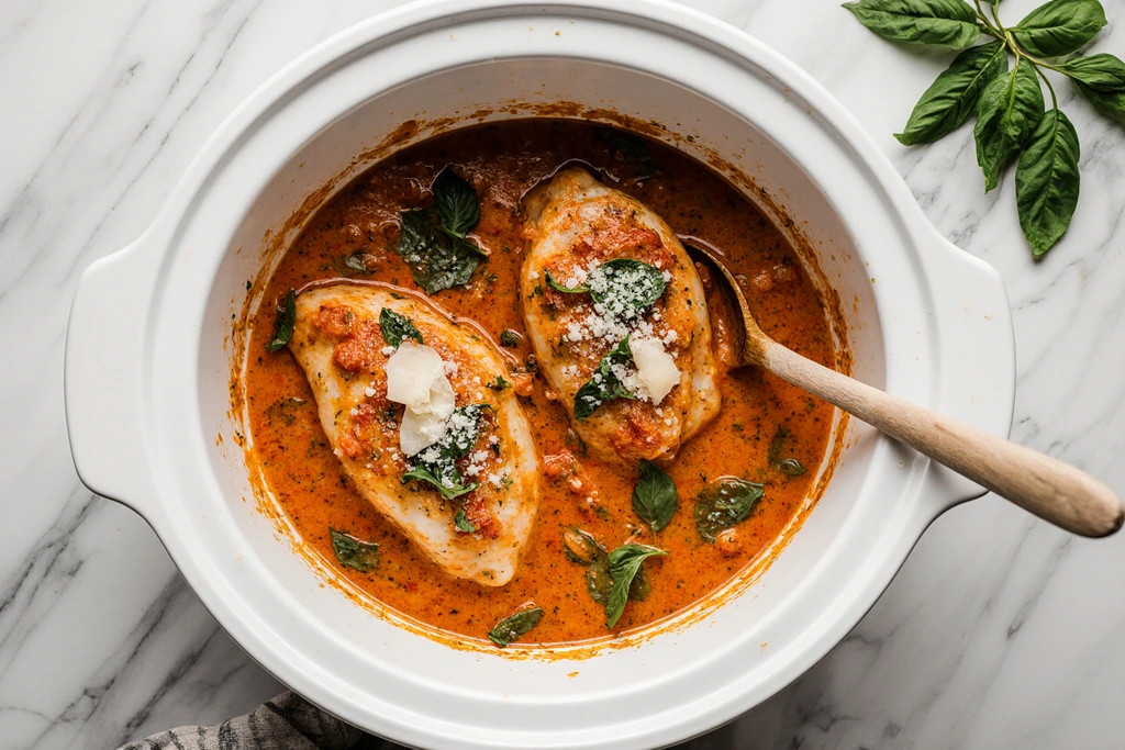 Tender chicken breasts in a creamy tomato basil sauce made in the slow cooker. Dump-and-go recipe with pantry staples, ready in 3-4 hours. Serve over pasta or rice for busy weeknights. Family favorite with juicy chicken and rich sauce that doesn’t curdle.