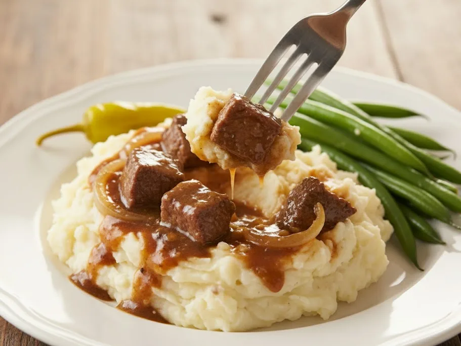 Slow Cooker Mississippi Steak Bites are tender sirloin pieces seared for flavor, then slow cooked with ranch seasoning, au jus gravy mix, butter, onion, and pepperoncini for a rich, tangy, savory gravy. Serve them over mashed potatoes, rice, or egg noodles for an easy comfort food dinner.