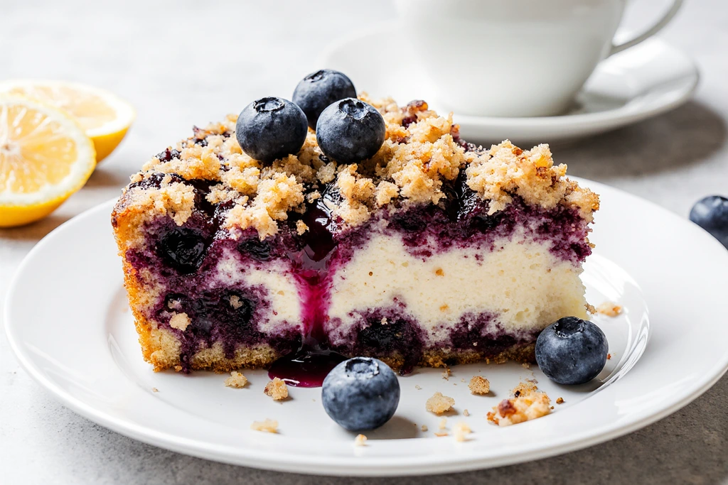 Moist blueberry cream cheese coffee cake with tender blueberry batter, thick cream cheese filling, fresh berries, and buttery streusel topping. Perfect breakfast, brunch, or dessert with optional lemon glaze.